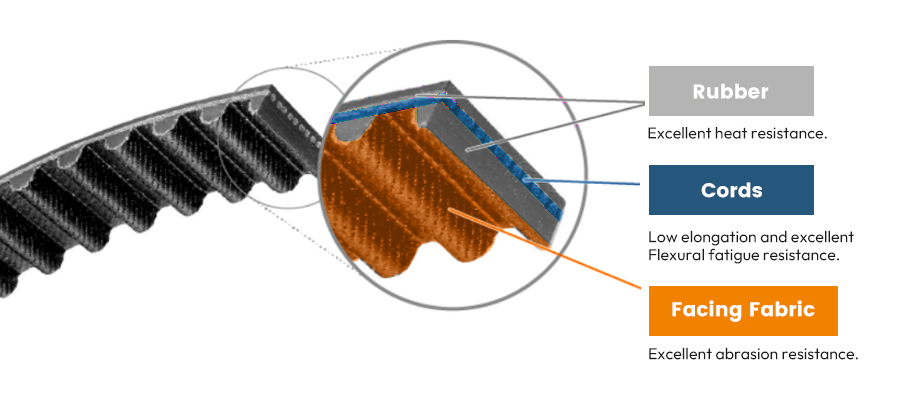 The timing belt made of hydrogenated nitrile rubber can work at -40℃~+150℃. Its durability is increased by more than 1.5 times, the bandwidth is reduced by 20%, and the heat resistance is increased by 10°C. Therefore, in terms of fatigue life and water resistance, it is better than timing belts made of chloroprene rubber and chlorosulfonated polyethylene.